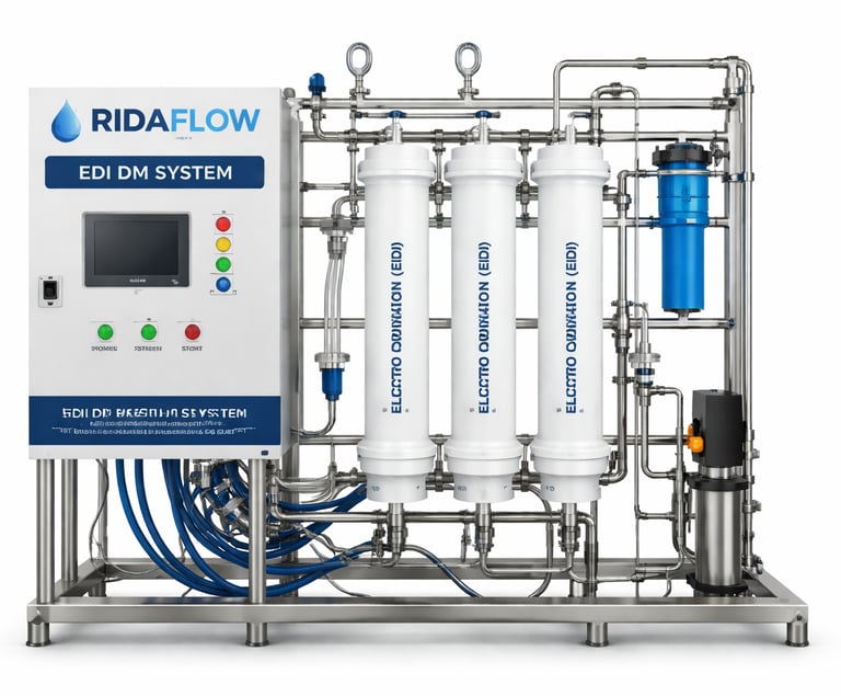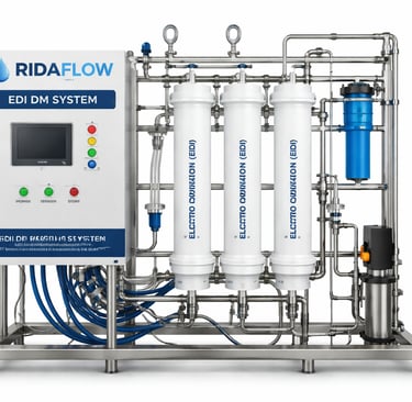 At Ridaflow we design Advanced EDI (Electrodeionization) and DM (Demineralization) system for water that produces ultrapure water (10−18 MΩ⋅cm) without the use of hazardous chemicals. It combines ion-exchange resins and selective membranes.